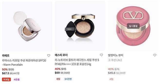 고가의 아이템으로 유명한 '라메르 루미너스 쿠션'부터 '에스티로더 리-뉴트리브 울트라 래디언스 세럼 쿠션', '발렌티노 뷰티 고 쿠션', 이 외에 '입생로랑 르 쿠션 엉크르 드 뽀'까지 다양한 명품 화장품 브랜드 쿠션을 면세점에서 구입 시 30~50%까지 할인된 가격으로 만나볼 수 있다.