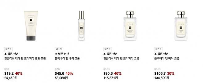 독보적인 향기로 많은 사랑을 받고 있는 브랜드 조 말론 런던의 제품들도 면세점에서 할인된 가격으로 만나볼 수 있다. 코롱 외에도 핸드크림, 바디크림, 디퓨저, 립 컨디셔너 등 다양한 선택지가 많아 선물용으로도 구입하기 좋다. 주의할 점은 면세점에서 향수 구입 시 최대 60ml의 용량 제한(수량 무관)이 있으므로, 한도 내인 30~50ml 사이즈로 구입하는 것을 추천한다.