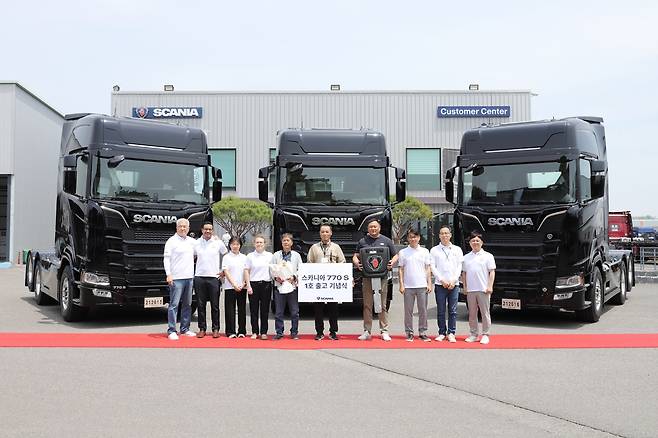 스카니아코리아는 자사 최상위 트랙터 모델인 '770 S'의 국내 1호차 출고를 기념하는 행사를 지난 13일 경남 사천 출하센터에서 진행했다고 밝혔다.