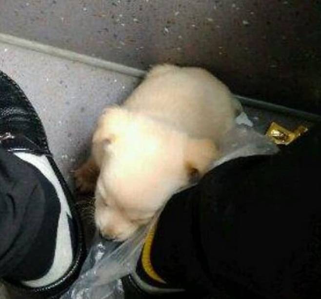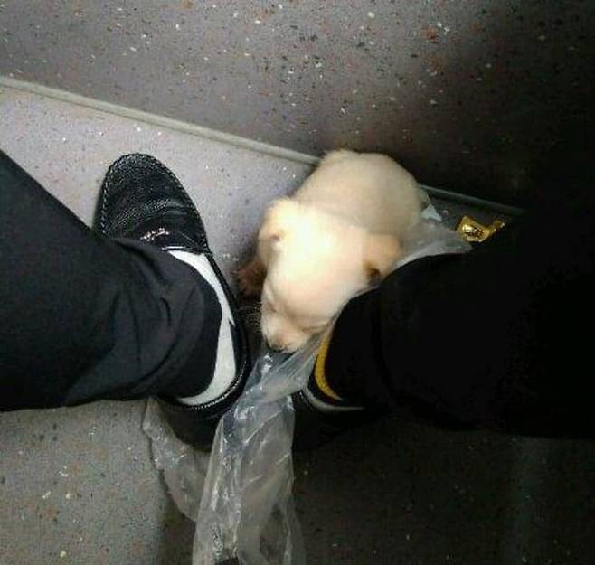 아기 강아지는 버스에 타자 오히려 조용해졌어요. 작은 몸이 추웠는지 아니면 아직도 겁을 먹었는지 행인 품에서 계속 떨고 있었습니다.