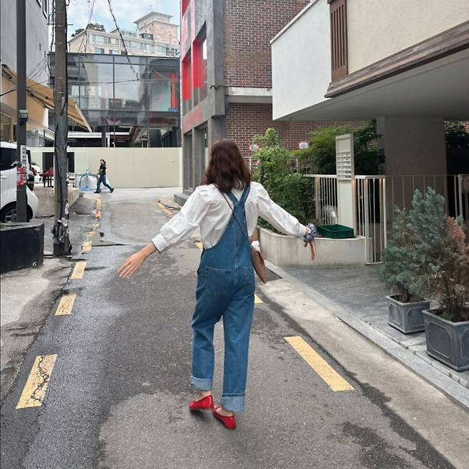 무엇보다 시선을 사로잡는 건 강렬한 레드 플랫슈즈! 클래식한 데님 룩에 상큼한 컬러 포인트로, 복고와 트렌디함을 모두 잡은 완벽한 한 끗 스타일링이었다.