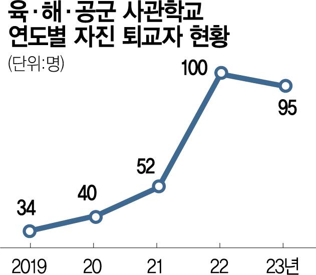 한편 임관하기 전 재학 중 자퇴하는 사관학교 생도들도 지난 5년간 300명을 넘어섰다. 송옥주 더불어민주당 의원이 국방부로부터 제출 받은 ‘각 군 사관학교 자진 퇴교자 현황’ 자료를 보면 2019년부터 올해 9월까지 자퇴한 생도는 321명에 달했다.