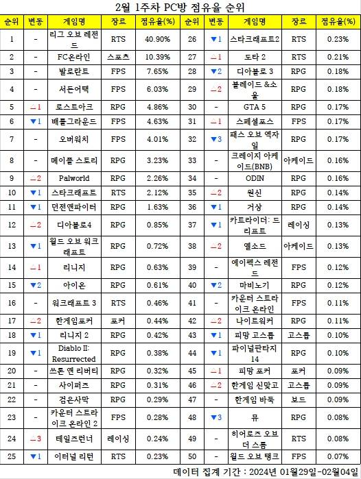 단, 시즌 초기화 2주차에 접어들며 상승세가 둔화되는 모습입니다. 블리자드가 신규 콘텐츠 추가와 PC방 혜택 강화를 내세웠으나 출시 2년차에 접어들며 절대적인 이용자 수가 줄어들면서 PC방 점유율 1%를 다시 넘기기 쉽지 않은 상황입니다. 설 연휴가 포함된 2월 2주차 순위에서 '디아블로4'가 1% 점유율을 넘기고 더 높은 순위에 자리할 수 있을지 지켜볼 일이네요.