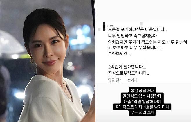 가수 출신 사업가 김준희가 지난 26일 자신의 SNS에 무척이나 황당한 메시지를 받았다며 이를 공개했다. "삶이 너무 힘드니 2억 원을 송금해 달라"는 메시지였다.