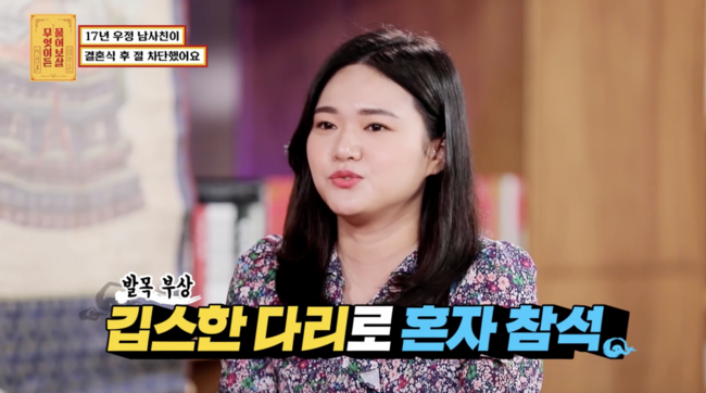 27일 방송된 KBS Joy ‘무엇이든 물어보살'에서 여성 사연자는 “17년 된 남사친이 축의금과 선물을 다 받고 나서 결혼식 일주일 뒤 저를 차단했다. 차단할 거면 결혼식 전에 해야 하는 것 아닌가. 결혼한다고 해서 무드등도 선물해줬다. 발목을 다쳐서 반깁스한 상태로 결혼식에 혼자 참석했다”고 밝혔다.