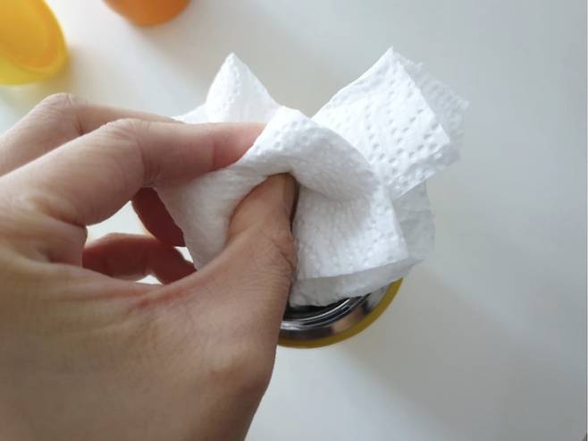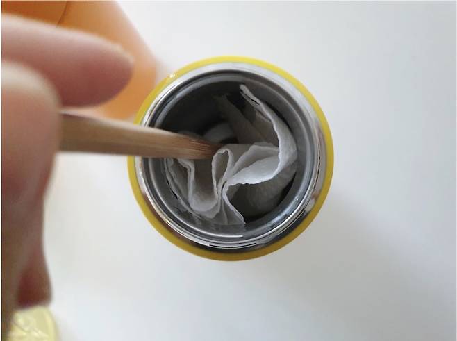 텀블러 안쪽에 키친타월을 넣어주고 안을 깨끗하게 닦아내 줍니다.