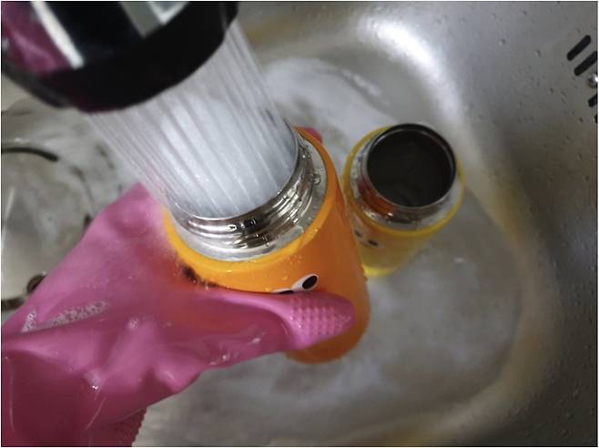입이 닿는 입구 쪽도 꼼꼼하게 박박 닦아내 주세요
