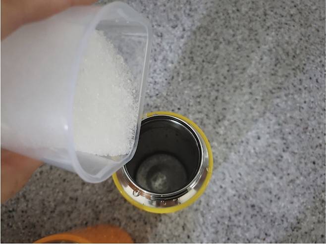 마지막으로 구연산도 한 스푼 넣어준 뒤 뜨거운 물을 가득 붓고 5분 정도 방치했다가 깨끗하게 씻어내주세요