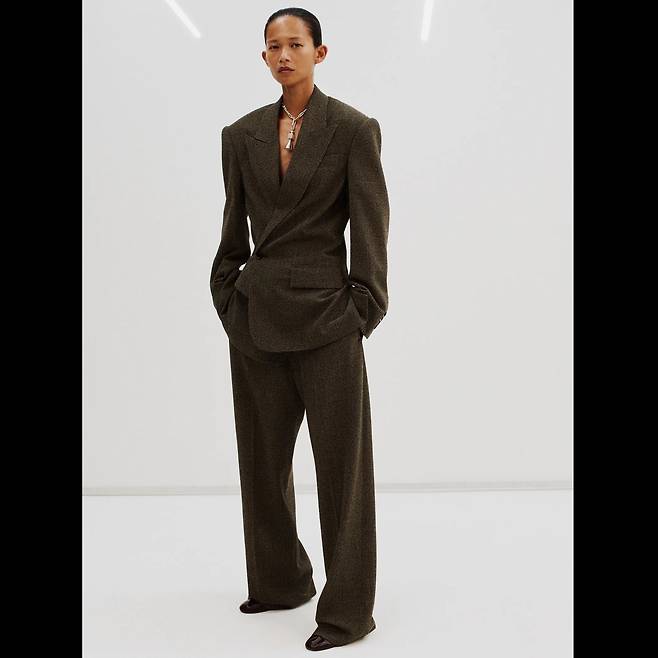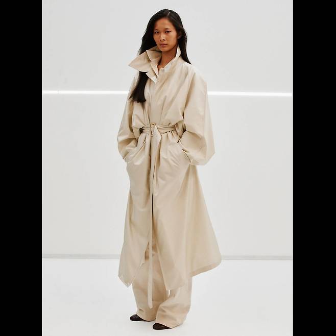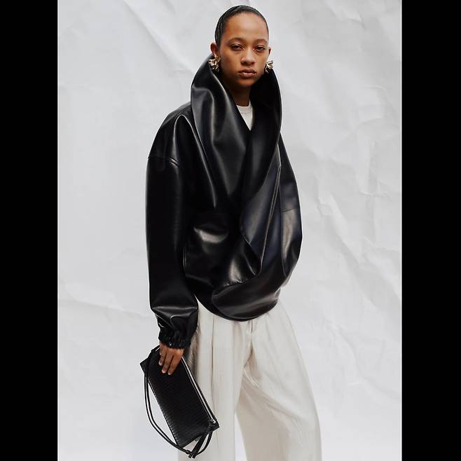 피비 파일로의 장기인 팬츠 라인 안에는 깃털 자수가 놓은 저지 트라우저, 생동감 넘치는 소용돌이 모양으로 손수 브러싱 한 솜털 같은 비스코스 팬츠 등이 있다. 품이 큰 티셔츠 드레스는 이 기발한 요소의 팬츠들과 대조를 이룬다. '트레인 탑(train top)'은 한쪽 어깨에 걸치든, 이브닝드레스처럼 등 뒤로 길게 늘어뜨리든 등장하는 순간 시선을 사로잡을 것. 양면으로 입을 수 있다는 점은 역시나 위트와 실용성을 고루 만족시킨 특징이다. 몸에 꼭 맞는 봄버 재킷부터 스탠드 업 칼라가 특징인 건축적인 디자인의 '스와드(Swathe)' 재킷까지 다양한 재킷 라인업도 인상적이다. 언제나 그랬듯 '일상을 거닐 수 있는 쇼피스'의 성격을 벗어나지 않은, 팬들의 기대감을 200% 충족시킨 피비 파일로의 신규 컬렉션은 내년 2월에 출시된다.