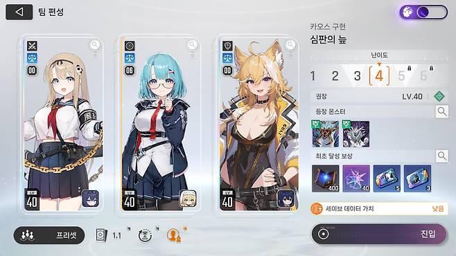 이런 확정적인 요소 외에도 턴이 시작될 때 낮은 확률로 일부 카드에는 '번뜩임'이 부가됩니다. 그 번뜩이는 카드를 사용하면 특수 카드를 획득하거나 혹은 그 카드에 3개의 강화 효과 중 하나를 골라서 적용할 수 있죠. 그 효과는 스토리 혹은 로그라이크 콘텐츠인 '카오스'를 도는 동안 유지되고, 종료 후에는 그게 기록으로 남아있습니다. 그외에도 로그라이크 중간에 획득한 장비나 카드는 세이브 데이터로 남는 만큼, 더 좋은 세팅을 위해서 빙빙 돌면서 각 캐릭터마다 최적화 세팅을 고민하는 재미가 있었죠.