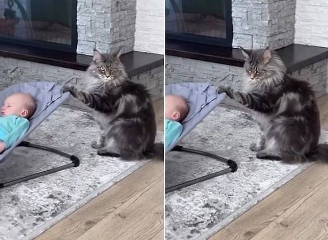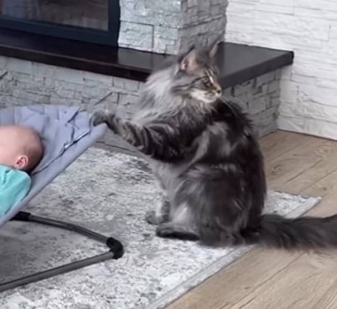 이날 고양이는 엄마 집사를 대신해서 아기의 흔들침대를 앞발로 열심히 흔들고 있었는데요. 다만 문제는 그 다음이었죠.