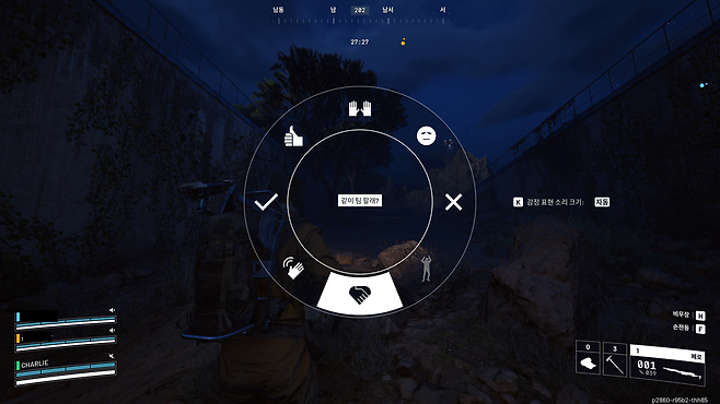 10. 협상도 생존 기술이다 이 게임에서는 감정 표현을 활용하여 다른 플레이어와 소통하고, 심지어 팀을 맺을 수 있다(!), 개발사에서도 이를 고려했는지 감정 표현을 열어보면 "쏘지 마"와 "같이 팀 할래?"가 함께 들어있다. 시작은 솔로이지만, 협상을 잘해서 듀오가 되거나, 트리오에서 말이 잘 통해 스쿼드 이상이 될 수도 있는 것이다. 또 탈출지 근처에서 쓰러졌을 때 자신을 죽이러 오는 적에게 연민의 감정을 불러일으켜 함께 탈출할 수도 있다. 물론 '적과의 동침'은 언제나 뒷통수를 조심해야 하는 점을 명심하자.