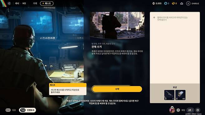 1. 임무 완료와 상인 활용으로 로드아웃을 강화하라 아크 레이더스도 익스트랙션 슈터의 기본적인 문법을 따르고 있다. 각 상인들에게 임무를 받고 진행하여 보상을 받을 수 있다. 무기, 탄약부터 가방, 치료제, 쉴드 충전기까지. 초반 부족한 무기와 장비를 보충하고, 맵의 구조를 익히는데 굉장히 유용한 시스템이다. 또, 상인들이 생존에 필요한 무기, 장비, 도구를 판매하기에 아이템을 팔아 얻은 수익으로 로드아웃을 대폭 강화할 수 있다.