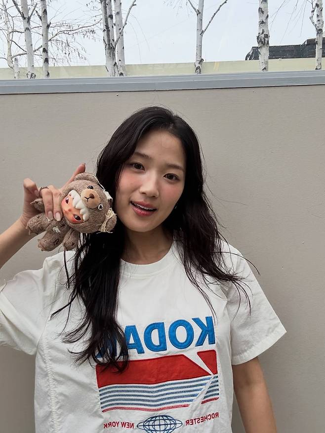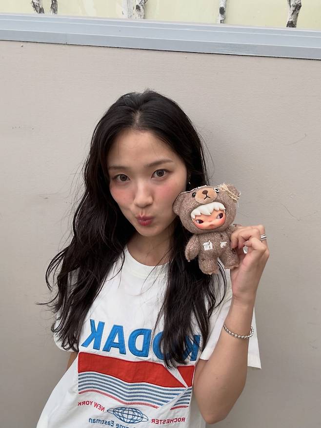 자연스럽게 층을 낸 롱 웨이브 헤어스타일은 김혜윤의 자유분방하고 러블리한 매력을 더해주며, 손에 든 귀여운 캐릭터 인형은 그녀의 장난기 가득한 이미지와 완벽한 조화를 이룹니다.