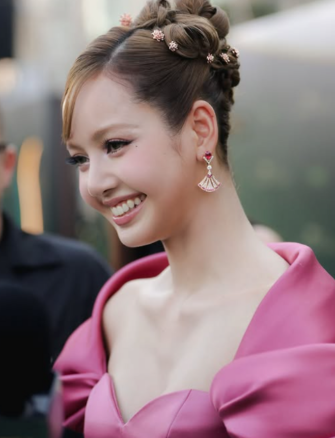 리사 님은 강렬한 존재감을 드러내는 진한 핑크 컬러의 셋업을 선택해 화려한 프린세스 무드를 연출했어요. 반짝이는 광택감이 고급스러운 느낌을 배가시키며, 무대 위에서 빛을 받으면 더욱 눈부시게 돋보였죠.