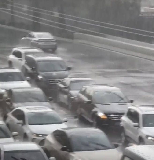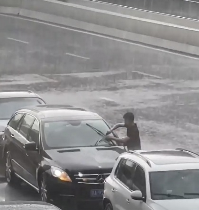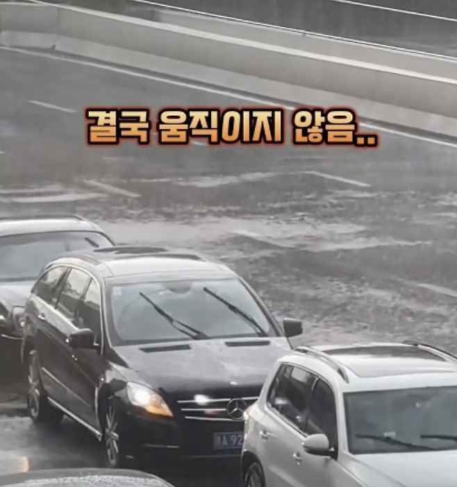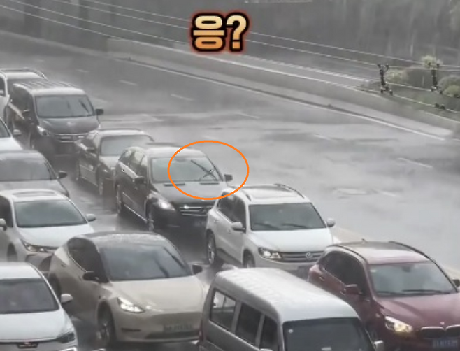 영상에 따르면 폭우가 쏟아지는 어느 도로에서 모든 차량이 바쁘게 와이퍼를 움직이고 있는 모습이 보인다.