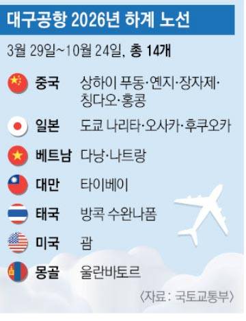 대구공항 국제선은 이번 하계에 모두 14개 노선을 운항한다. 일본 노선은 도쿄나리타·오사카·후쿠오카 3개, 중국 노선은 상하이푸동·옌지·장자제·칭다오·홍콩 5개, 대만 노선은 타이베이 1개, 동남아 노선은 방콕수완나폼(태국)·다낭·나트랑(이상 베트남) 3개, 미주 노선은 괌(미국) 1개다. 몽골 울란바토르 노선도 운항된다.
