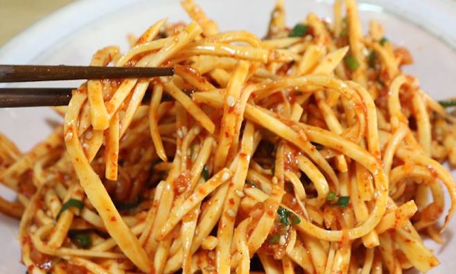 껍질을 벗겨 얇게 채 썬 새콤달콤하게 무치면 완성입니다. 입맛이 없을 때, 입안 가득 아삭한 고구마의 식감이 입맛을 다시 돌게 해줍니다.
