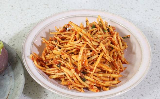 고구마생채는 식이섬유가 풍부해 장내 유익균을 늘리고 변비를 개선해줍니다.
