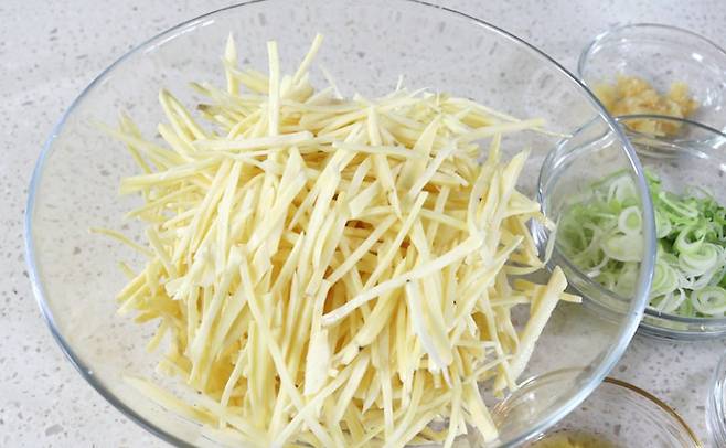 고구마는 가늘게 채 썰어 찬물에 담가 전분기를 제거합니다. 얇고 가늘게 썰어야 양념이 잘 배고 식감도 부드럽습니다.
