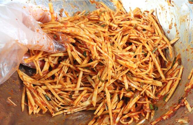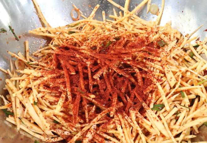 물에 담가 전분기를 빼고 채썬 고구마에 파, 간마늘, 설탕, 고춧가루를 넣고 가볍게 버무려 줍니다.