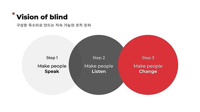 사업 확장을 넘어 블라인드의 궁극적 목표는 하나예요. 바로 구성원 목소리로 만들어가는 건강한 기업 문화입니다. 블라인드는 목표 달성을 위한 로드맵을 세 단계로 보고 있어요. 먼저 구성원이 자신의 이야기를 두려움 없이 말할 수 있어야 하고요. 회사는 구성원 이야기를 왜곡 없이 들을 수 있어야 하죠. 그래야만 저희의 궁극적 목표, 건강한 변화가 가능해진다고 믿어요.