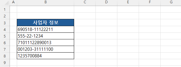 문제 1) B 열에 주민등록번호와 사업자등록번호가 입력되어 있습니다.
