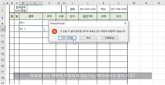 4) 이번에는 직접 'PC'라고 입력하고 한 칸 띄어 '1'을 입력합니다. 그렇게 된다면 유효성 검사 제한에 부합되지 않는다는 에러 메시지 창이 뜨게 됩니다.
