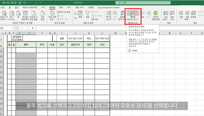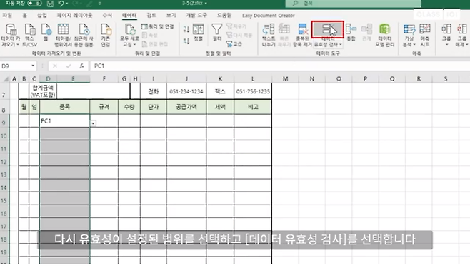 1) 다시 유효성이 설정된 범위를 선택하고 [엑셀 데이터 유효성 검사]를 선택합니다.