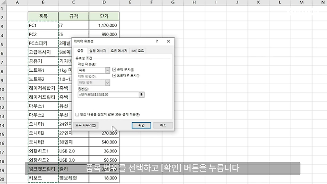 1) 품목 범위를 선택하고 [데이터] 탭에 [데이터 유효성 검사]를 선택합니다. [데이터 유효성] 대화상자가 실행되고 [제한 대상] - [목록]을 선택합니다.