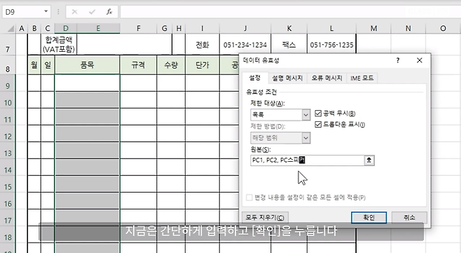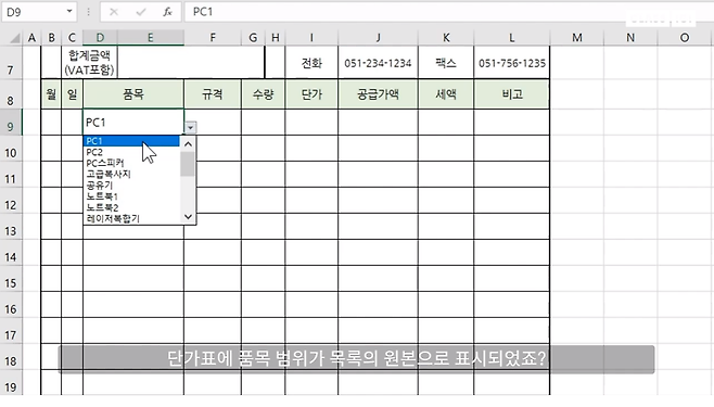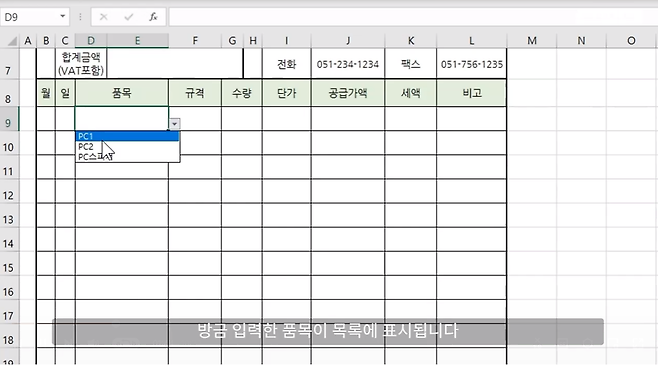 3) 품목 셀을 선택하면 화살표 모양의 목록 버튼이 생겼습니다. 방금 입력한 품목이 목록에 표시됩니다. 여기서 PC1을 선택하면 자동으로 입력됩니다.