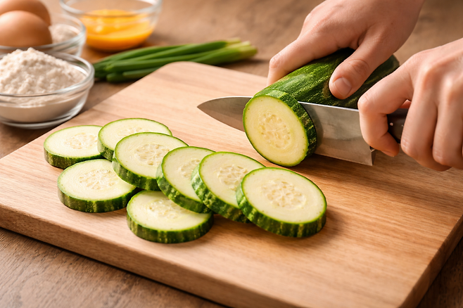 애호박이 살이 오르는 계절이면 어김없이 떠오르는 메뉴가 바로 애호박전입니다. 집 앞 마트에서 쉽게 구할 수 있는 재료로 누구나 쉽게 도전할 수 있죠. 하지만 막상 만들어보면 물기가 너무 많이 나오거나 반대로 퍽퍽해서 실망하는 경우가 많습니다. 성공적인 애호박전의 비밀은 바로 소금 밑간에 있습니다. 이 한 단계만 제대로 해도 호박의 단맛이 배가되고 식감도 훨씬 부드러워지거든요. 오늘은 밥반찬으로도 손색없고 손님상에 내놔도 부끄럽지 않은 애호박전 레시피를 소개해드리겠습니다.