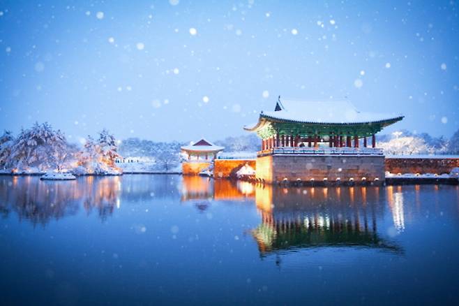 겨울밤, 눈 내린 풍경 속 동궁과 월지를 바라보며 천천히 산책해 보는 것도 좋을 듯합니다.
