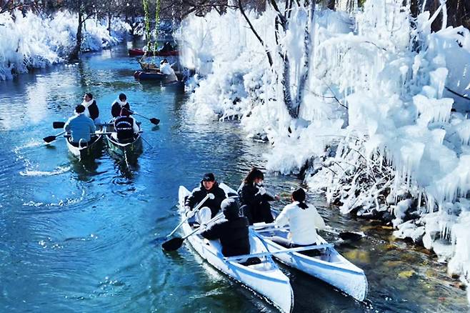빙벽으로 둘러싸인 강을 따라 카누를 타고 경치를 즐길 수 있는데요. 넓게 펼쳐진 눈밭과 빙벽의 풍경은 SNS에서 포토 스팟으로 유명하죠.