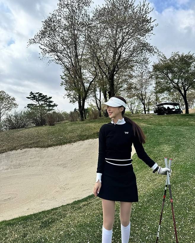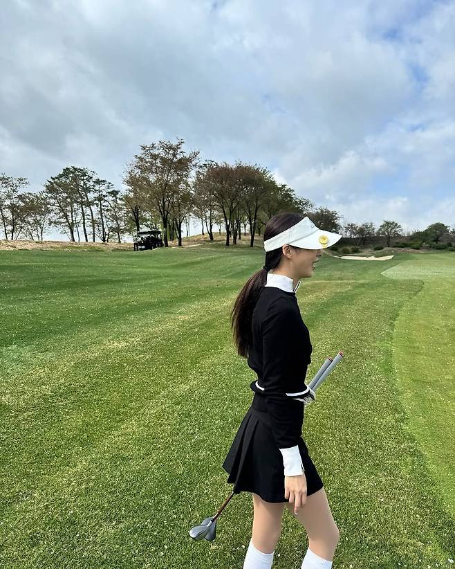 조승희의 이번 착장 포인트는 단연 '블랙 앤 화이트의 조화'다. 상의는 몸에 적당히 핏되는 블랙 컬러의 하프 집업 톱으로, 넥라인과 소매에 화이트 포인트가 더해져 단정한 인상을 준다. 허리 라인의 배색 밴딩 디테일은 시선을 자연스럽게 끌며 실루엣을 더욱 날씬하게 연출한다. 하의는 군더더기 없이 깔끔하게 떨어지는 블랙 미니스커트로, 활동성을 강조하면서도 여성스러운 무드를 놓치지 않았다. 전체적인 톤을 맞춘 무릎 아래 길이의 화이트 삭스와 베이직한 골프 장갑, 그리고 바이저 캡은 햇살 아래에서도 실용성과 스타일을 모두 갖춘 구성이다.