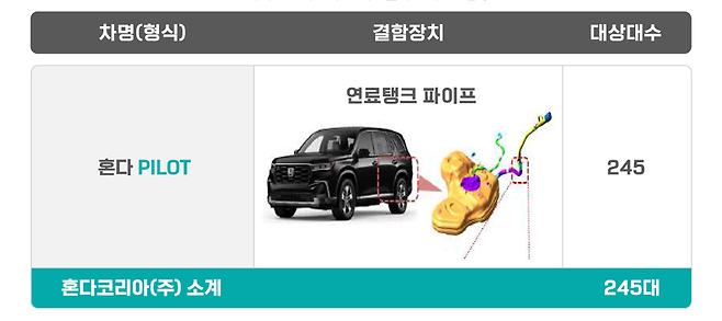 혼다 파일럿 245대는 연료탱크 파이프와 연료 주입구의 체결 불량에 따른 연료 누출 가능성으로 12월 20일부터 시정조치에 들어간다.