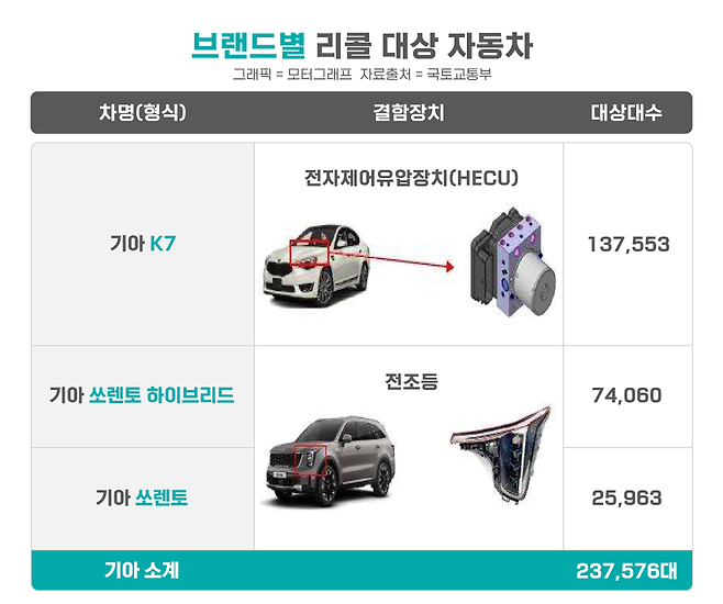 기아 K7 13만 7553대는 전자제어유압장치(HECU) 내구성 부족에 따른 화재 발생 가능성으로 12월 16일부터 시정조치를 진행하고 있고, 쏘렌토 하이브리드 등 2개 차종 10만 23대는 주간주행등이 정상 작동하지 않는 안전기준 부적합으로 12월 18일부터 시정조치에 들어간다.
