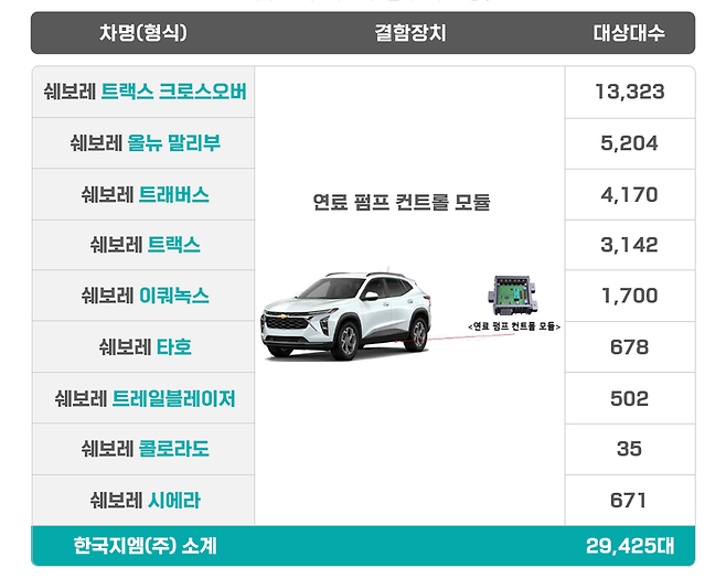 한국지엠 트랙스 크로스오버 등 13개 차종 3만 1057대는 연료펌프 컨트롤 모듈 내구성 부족에 따라 시동이 꺼질 가능성으로 12월 23일부터 시정조치에 들어간다.