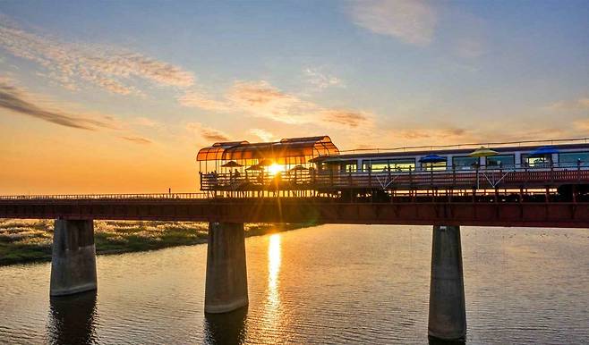 전북 완주군 삼례읍, 만경강을 내려다보는 옛 철교 위에 독특한 열차가 멈춰 서 있다. 이름도 특별한 ‘비비정예술열차’이다. 일제강점기 농산물 수탈을 위해 1928년 건설된 구 만경강 철교는 지금, 예술과 여유가 머무는 문화공간으로 다시 태어났다. 과거와 현재가 만나는 이곳은 근대문화유산으로 등록된 역사적 장소에 새마을호 열차를 리모델링해 조성한 명소다.
