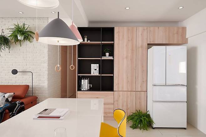 이를 위해 독특한 컬러를 공간 중앙이 아닌 양 사이드로 배치하고, 특정 면에 사용하는 대신 라이트, 주방 용기 등과 같은 소품, 가전제품을 활용했다.
