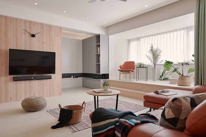 이 타이베이 아파트는 거실과 발코니 사이 창을 없애고, 거실과 단 차이를 만들어 분리했다. 이렇게 단을 쌓아 다른 공간이면서, 발코니, 거실 모두 확장성을 가지게 되어 공간이 배는 넓어 보이도록 하는 효과를 만들었다.
