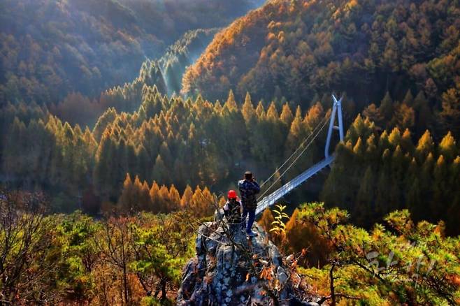 장태산은 데크 산책로를 따라가면서 스카이 타워를 올라갈 수 있을 뿐만 아니라 다리를 건너면서 가을 색을 입은 메타세쿼이아 나무들을 감상하는 것도 가능하다.
