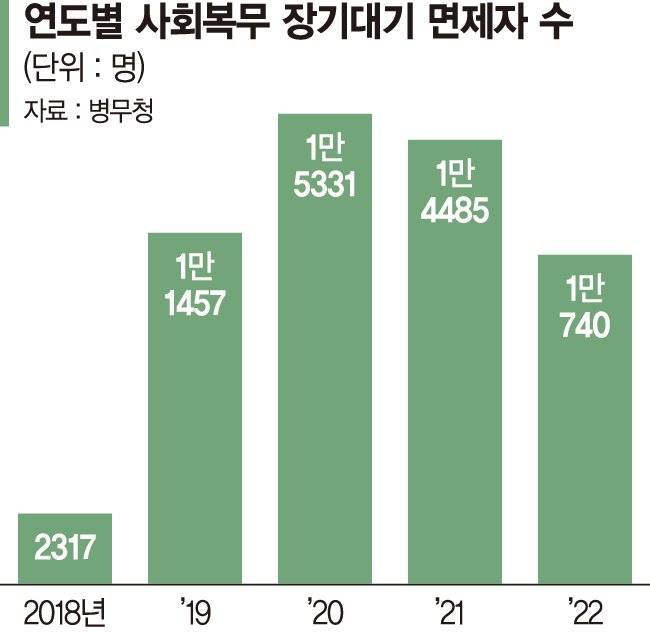 장기 대기에 따른 사회복무요원 면제자 수는 2016년 11명·2017년 90명 수준이었지만 2018년 2317명·2019년 1만1457명·2020년 1만5331명·2021년 1만4485명으로 급증했다.