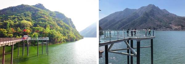 전망대는 쓰리핑거라고 부르는 세 손가락 형태의 강화유리 바닥이 뻗어있습니다. 고강도 삼중 유리를 통해 발밑에 흐르는 남한강을 내려다보며 절벽 끝에서 걷는 스릴을 경험할 수 있습니다.