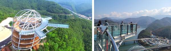 충북 단양군에 위치한 만천하 스카이워크는 아름다운 남한강 절벽 위에 있습니다. 시내 전경과 함께 소백산과 연화봉, 남한강이 한눈에 보이는 구조로 되어있어 뷰가 너무 좋으며, 전망대 끝에는 망원경을 무료로 볼 수 있도록 되어있어 구경하는 재미도 있습니다.