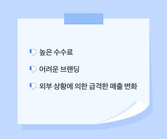 - 진입장벽이 낮은 만큼 가격 경쟁이 치열해요. 판매할 때마다 수수료를 내야 하는데, 상품 마진율을 미리 계산해 보지 않으면 상품을 팔수록 손해 볼 수 있어요.