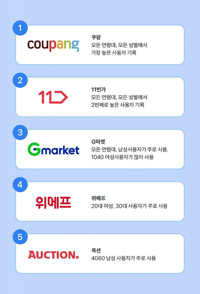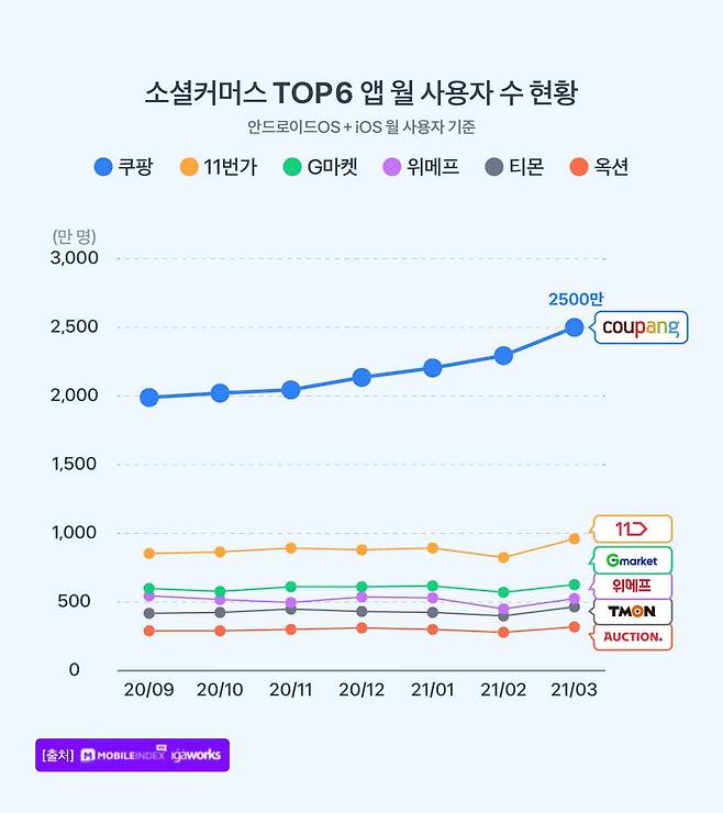 쿠팡(총 2,503만 6,170명) > 11번가 (총 965만 4,597명) > G마켓 (총 630만 287명) > 위메프 (총 526만 2,084명) > 티몬 (총 468만 9,758명) > 옥션 (총 325만 546명)
