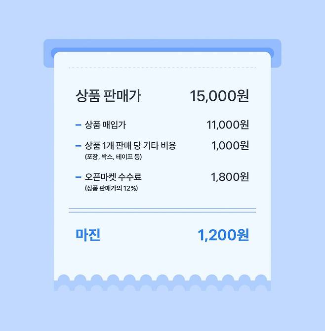 - 마진 = 상품 판매가 – 상품 매입가 – 기타 비용 – 오픈마켓 수수료