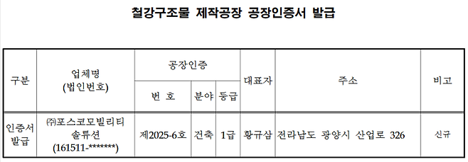 포스코모빌리티솔루션(대표 김상균) 광양 1공장이 철강구조물 제작공장 인증서를 발급받았다. 회사의 철강재 가공·유통 연계 사업에 시너지 효과가 더해질 것으로 기대된다.