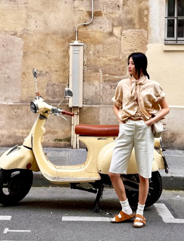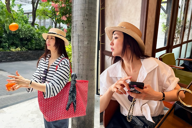 또 다른 사진에서는 베이지 셔츠와 버뮤다 팬츠, 샌들 조합으로 내추럴하면서도 센스 있는 여름 룩을 선보였다.